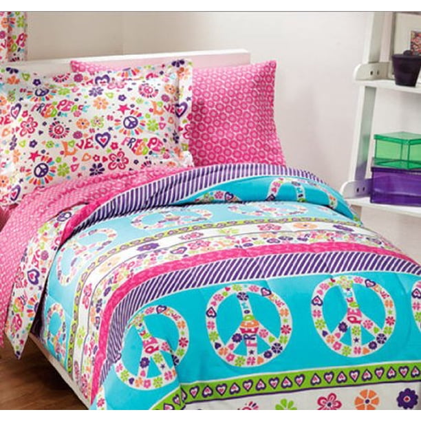 Pink Blue Peace Signs Love Full Comforter Set 7 Piece Bed In