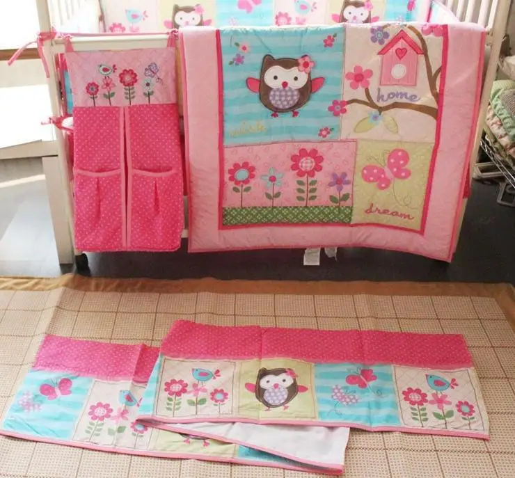 7 Piece Pink Owl Bird Embroidery Animal Motifs Girl Baby Crib