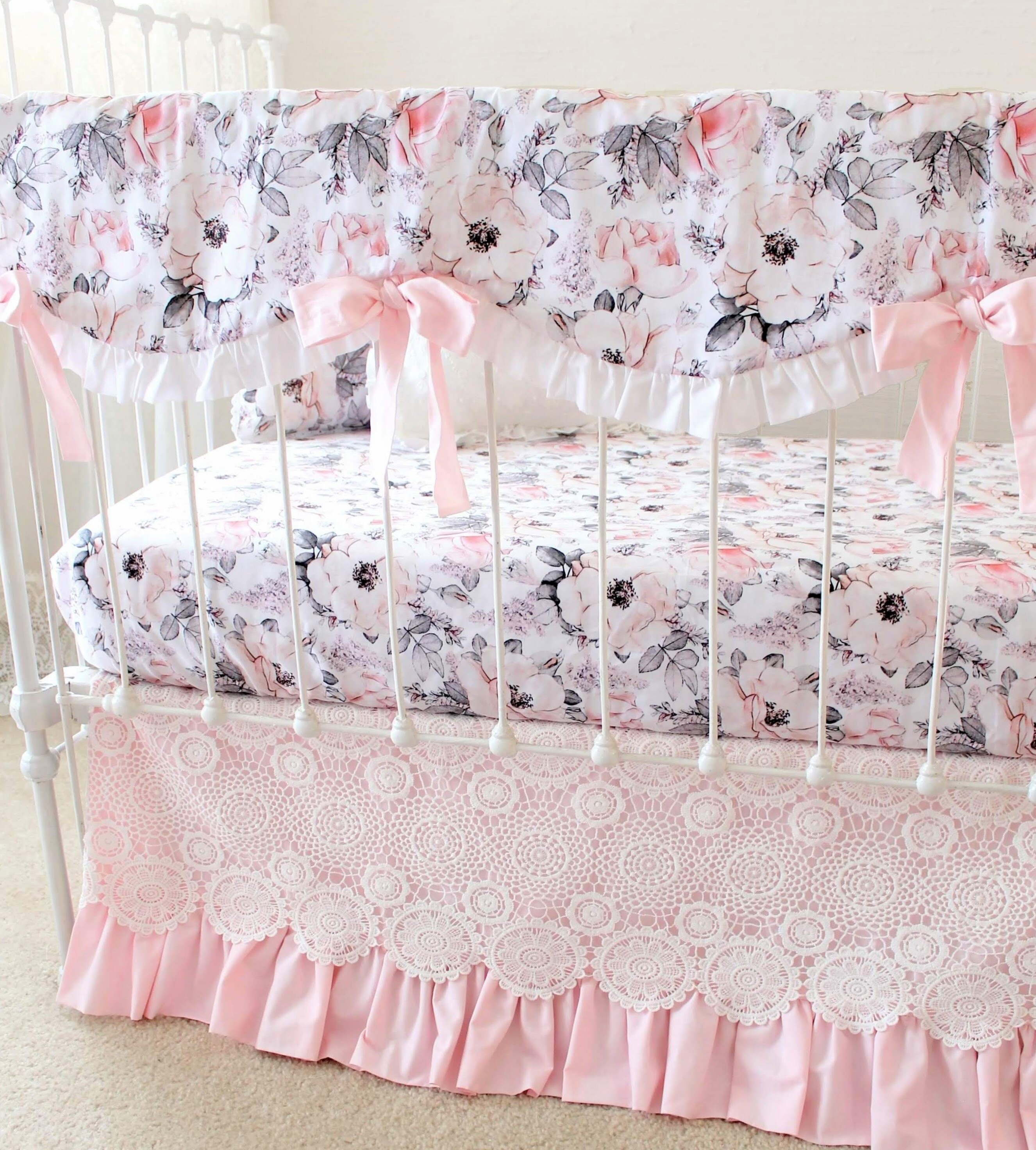 Snowy Rose Floral Crib Bedding Pink Black White Baby Bedding Etsy