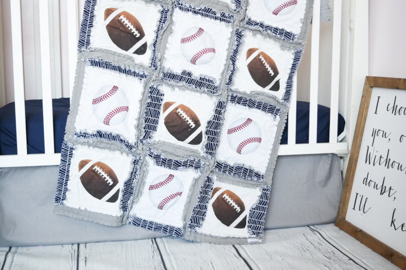 Navy Blue Gray Football Baseball Plaid Sports Baby Boy Rag Quilt