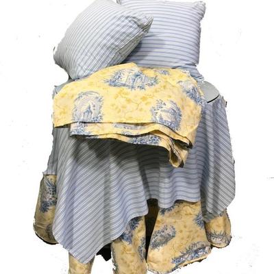 Queen Yellow Blue Toile Custom Bed Skirt With Matching Table